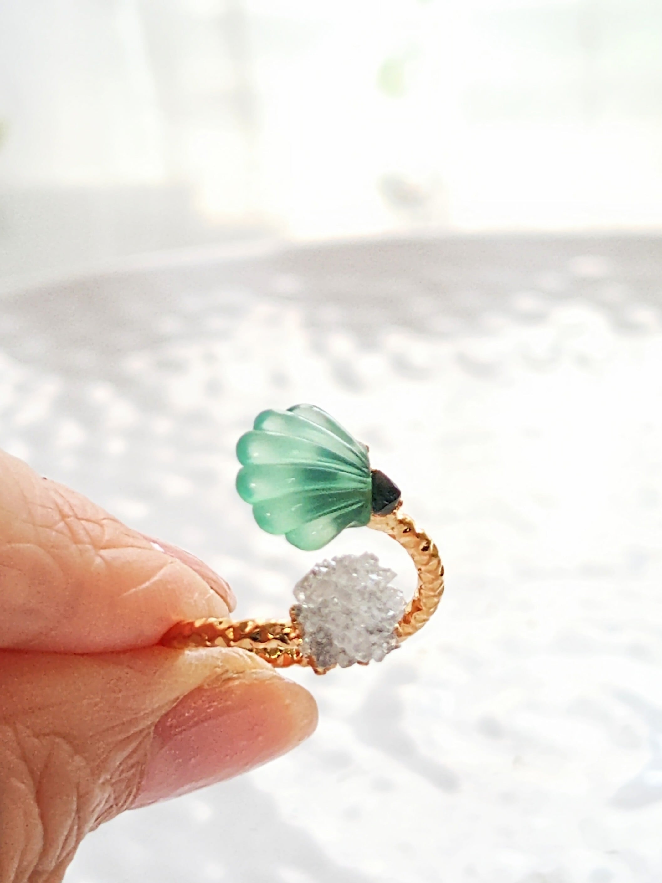 アップルグリーンとドゥルージー水晶とのコントラストが爽やかさを印象付けます。