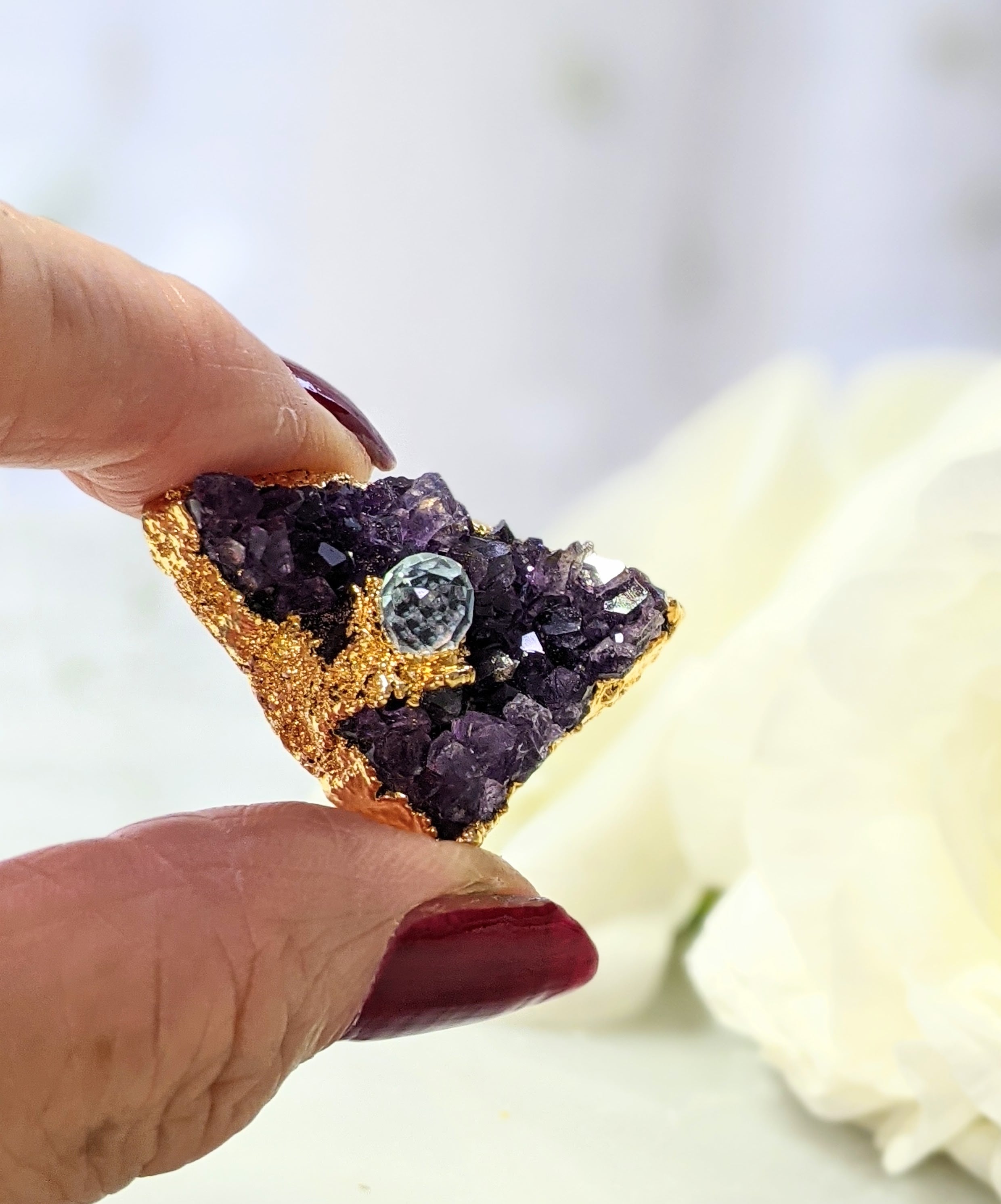 アメジストを包むように、エレクトロフォーミングの技法を使った24kゴールドメッキが施されています。
