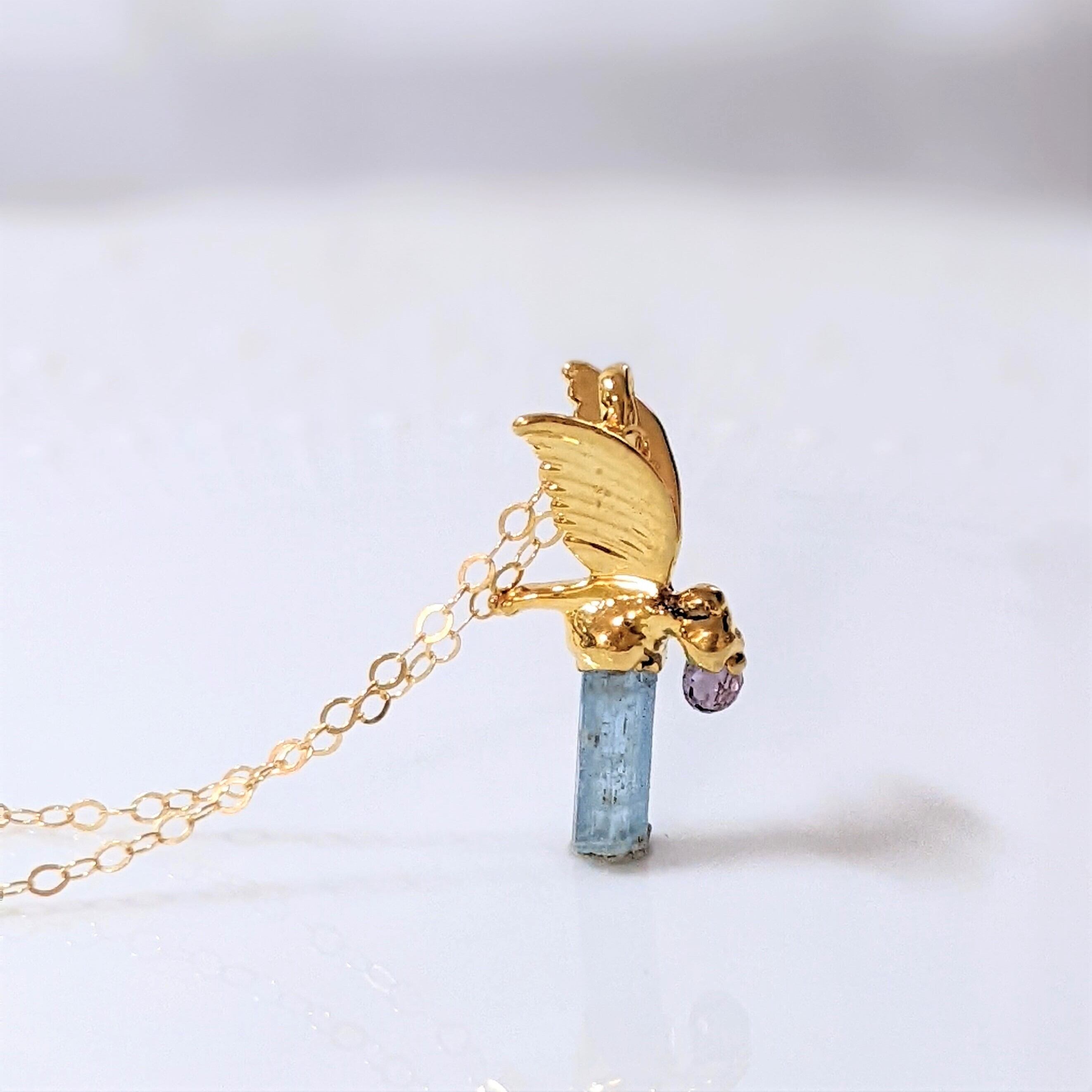 ペンシルカットアクアマリン、ハミングバードのペンダント。