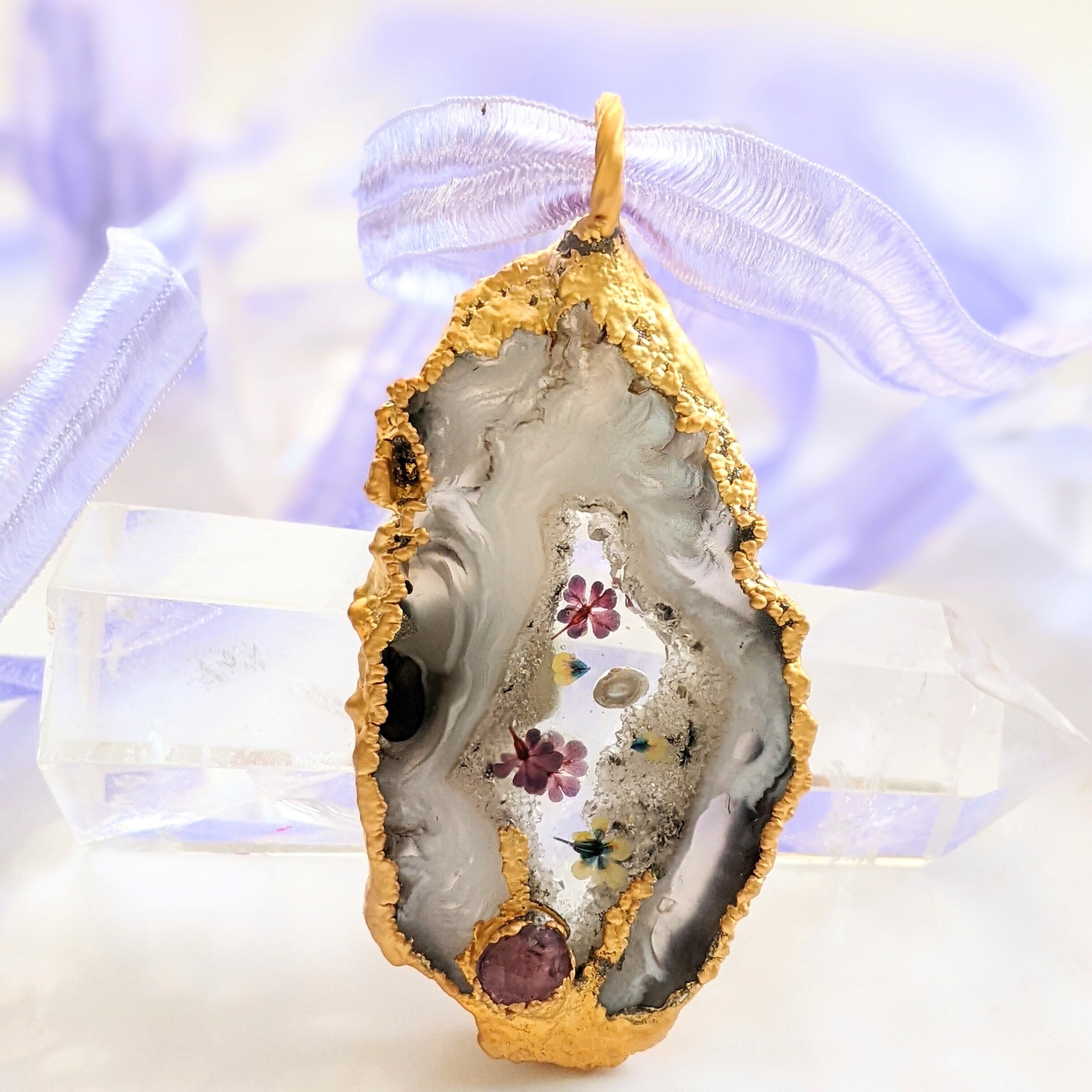 スライスされたアゲートのジオード部分に、小さなドライフラワーやパールなどをコラージュしました。