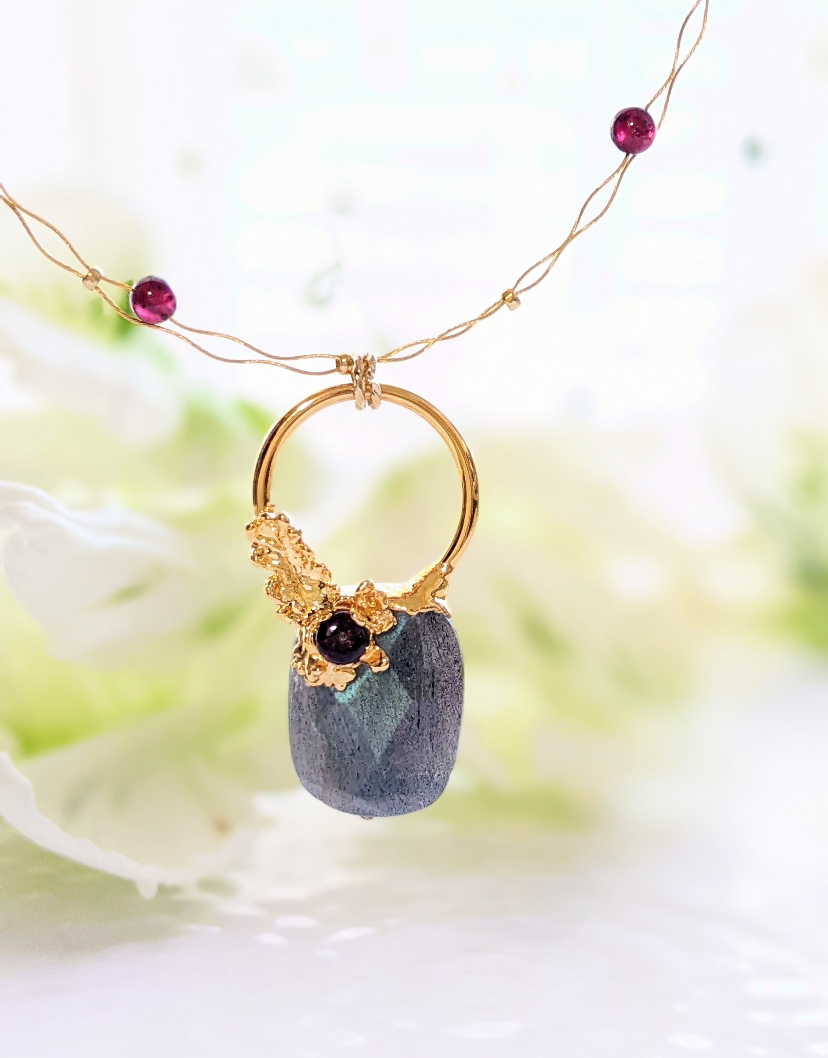ネックレス部分にはウエーブワイヤーとガーネットのビーズを使用し、軽やかさと愛らしさを添えています。