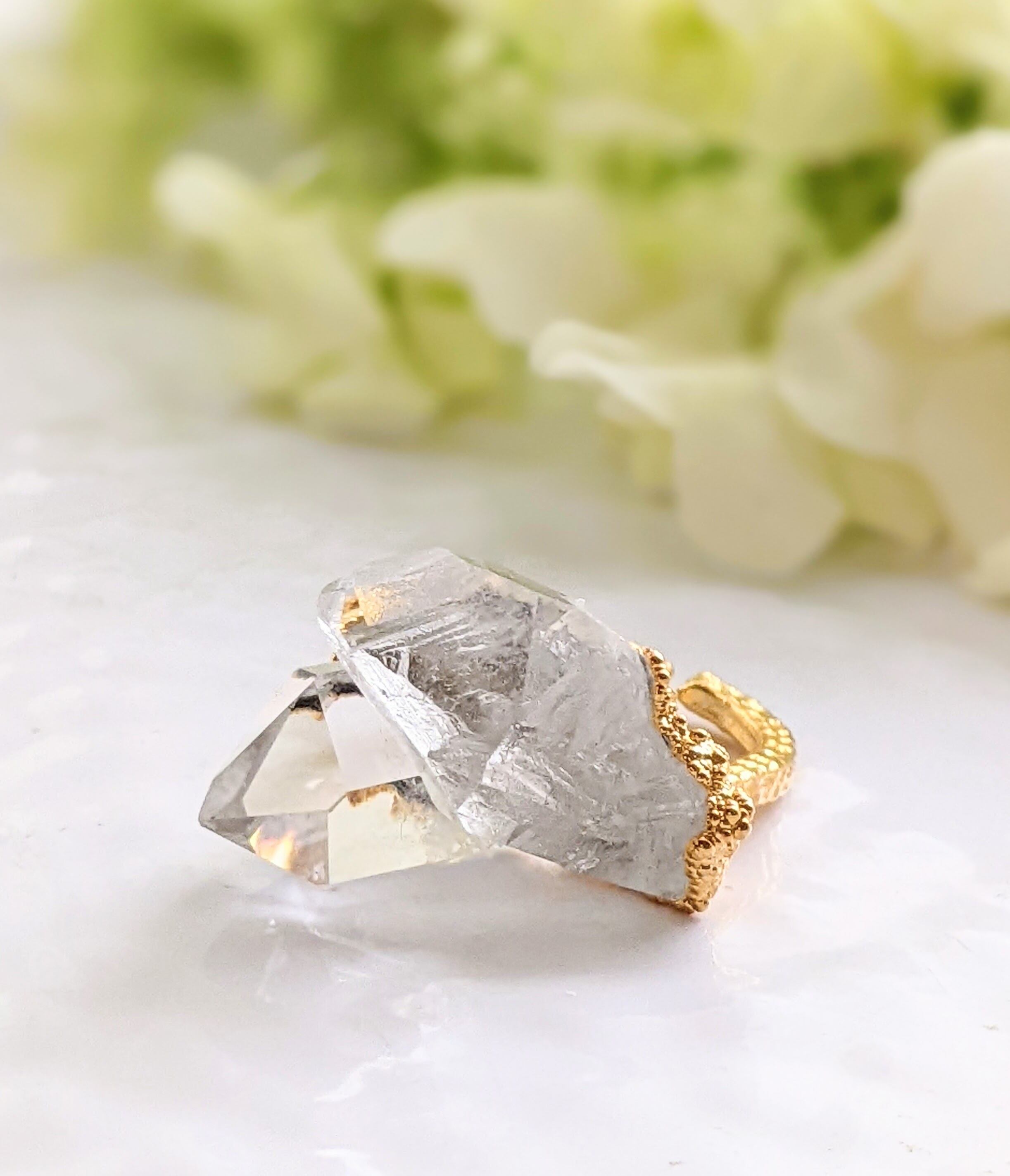 クラスターのユニークな形をそのまま活かし、美しく伸びた水晶の剣先が指に添うようにデザインされています。
