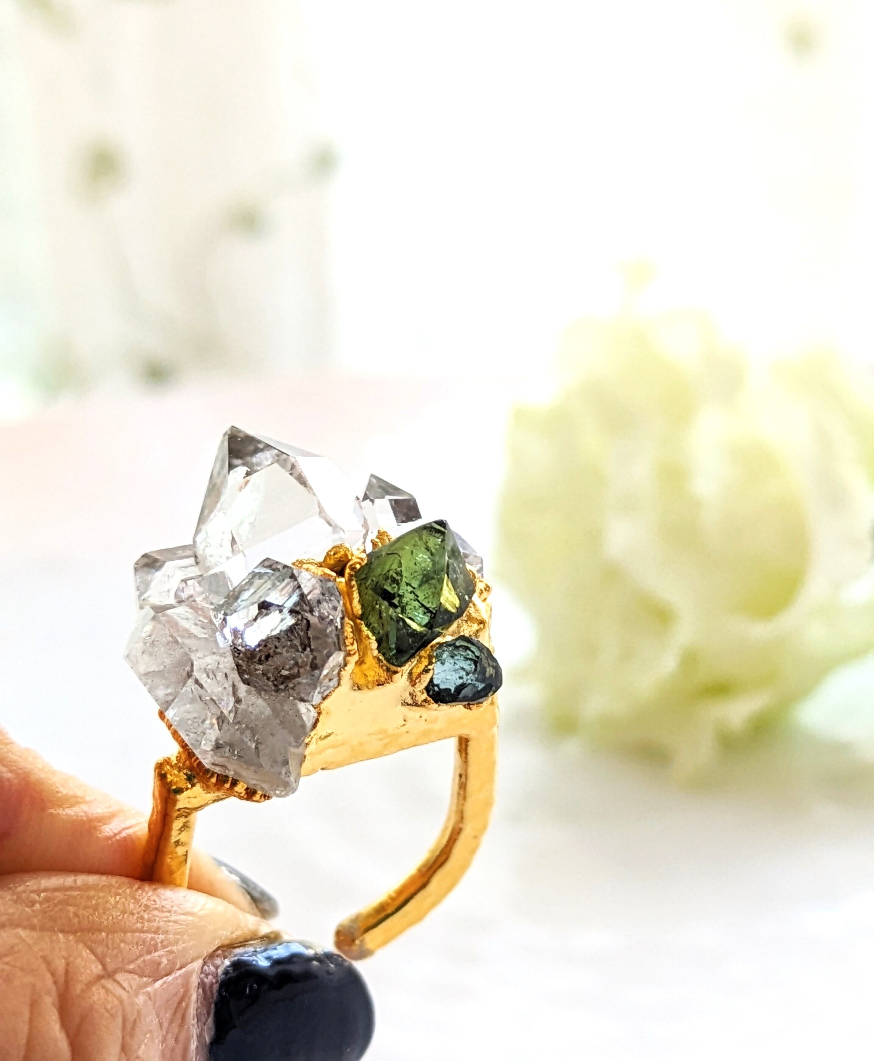クラスター(群生)の状態のハーキマーダイヤモンドをそのまま活かしたリングです。