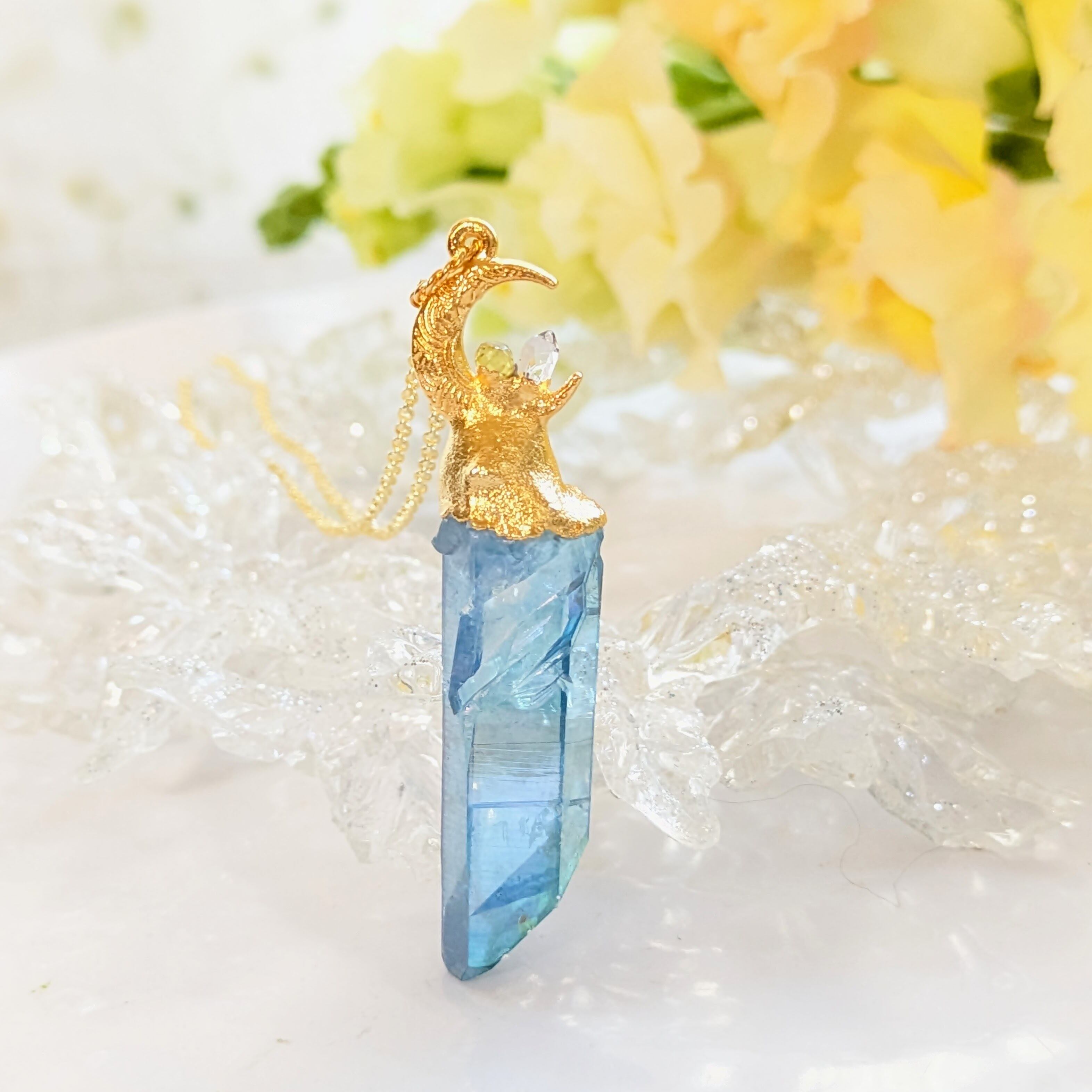 水晶に金属を蒸着して色づけされた、清らかなブルーの光を放つアクアオーラネックレスです。